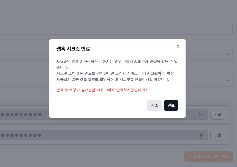 • 먼저 웹훅 시크릿을 추가로 하나 더 발급합니다. (웹훅 시크릿은 테스트/실연동 환경별로 각각 동시에 최대 2개까지 발급 가능합니다.)